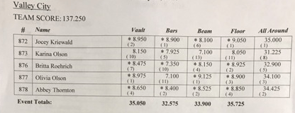 Individually Valley City claimed the top 3 spots in the all around. Jocey Kriewald was 1st scoring 35, she was 1st in the bars and floor. Abbey Thornton took 2nd with a pair of second place finishes in the bar and beam. Olivia Olson won the vault and beam to earn a 3rd place finish in the all around.