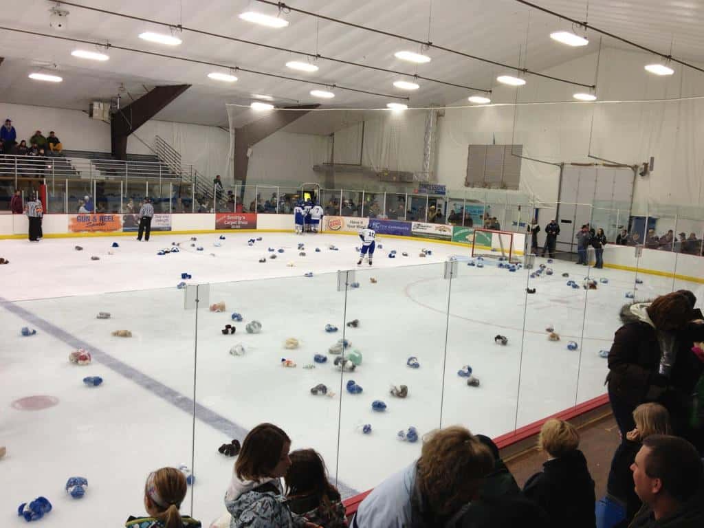 N.D.- A lot of blue and white teddy bears were thrown on the ice at Wilson Arena on Thursday night, and it was all for a great cause.