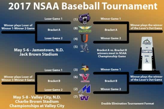 S.D.(PlayNorthStar.com) – The brackets for the 2017 North Star Athletic Association Postseason Baseball Tournament are set. Jamestown and Valley City State will be this year’s conference tournament host sites, with the opening round starting on Friday, May 5. Top eight seeds advance to the NSAA Baseball Postseason Conference Tournament, which will feature two brackets—Bracket A and Bracket B—using a double-elimination within each bracket.