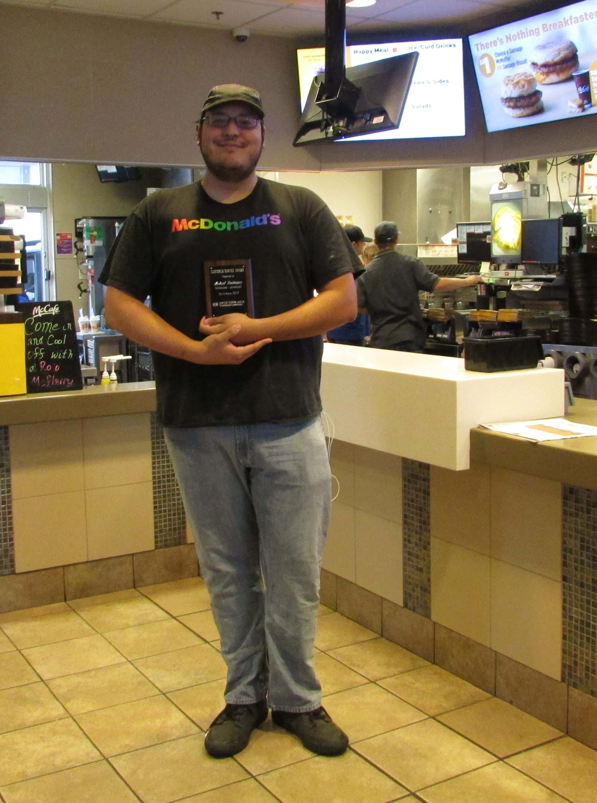 letter of nomination stated, “Mike has waited on me more than 20 times in the past 6 to 8 weeks. He is always extremely friendly, helpful and very respectful. I would think that he does not just do this for me, but he for everyone. He always asks how your day is going and tells you to have a nice day. He is a great person to have at the window, and he is always smiling. As a frequent customer, I have had good experiences at the window, or inside for that matter, and I will definitely return. I do not think fast food employees get the credit they deserve and I really think Mike is a great example for other employees to follow. I sincerely hope he is considered for this award, as he deserves the recognition.”