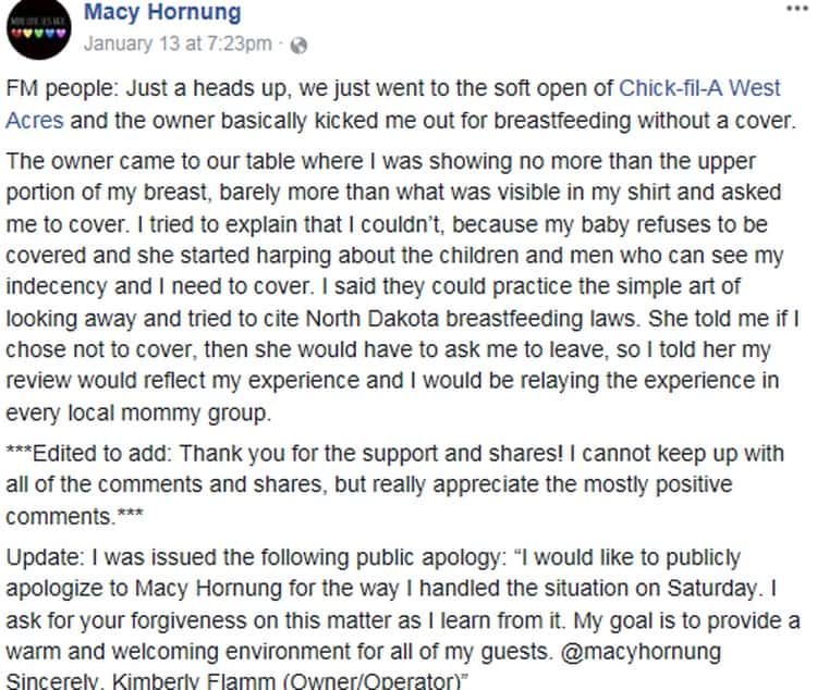 Macy Hornung’s post on Facebook has went viral on social media. She wrote that her family was kicked out of the restaurant Saturday because she was breastfeeding her baby without a cover. She says she was showing no more than the upper portion of her breast when the owner approached and told her to cover. When she explained her baby refused to cover, and attempted to explain North Dakota breastfeeding laws, she said the family was asked to leave.?