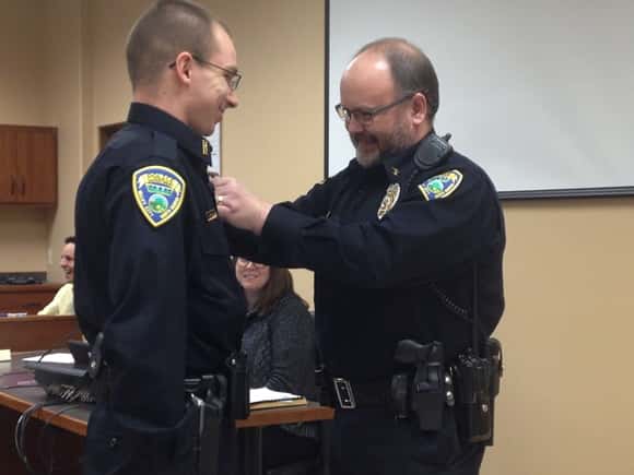 Far right Police Chief Phil Hatcher pins a police officers badge onto Matthew Knight’s uniform on January 16th in the city commission chambers.