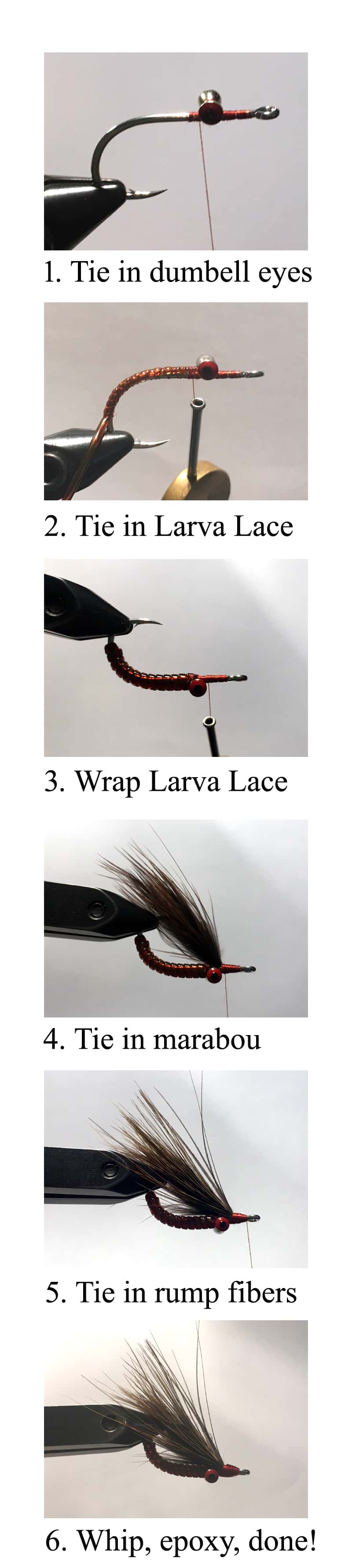 Start the fly by securing the hook in the vise and laying down a base of thread and tie in the dumbbell eyes (1). Once secured, tie in a five-inch strand of Larva Lace along the top of the hook shank and up the curl of the bend, before advancing the thread back to just behind the dumbbell eyes (2). Wrap the Larva Lace forward so each segment touches the previous one until it reaches the thread; at that point tie the ribbing off securely and trim the excess, advancing the thread in front of the dumbbell eyes (3).