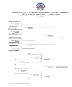 The Class A West Regional Tournament will run from July 24–26, with the top four teams advancing to the Class A State Tournament in Casselton, scheduled for July 31–August 1.