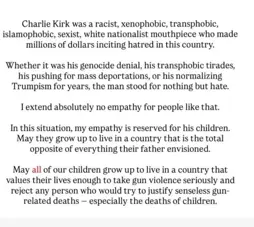 Below is the social media post by a VCPS employee issued after the shooting death of Charlie Kirk.