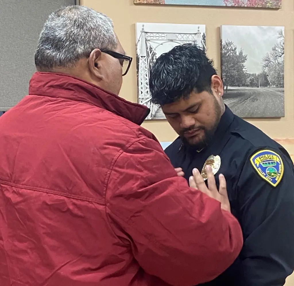 Officer Mageo’s father had the honor of Pinning the Badge on his son just before the City Commission meeting on January 6th.