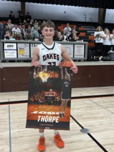 The Tornadoes would slow down in the 3rd quarter as they would only go 4/10 from the field while Blake Theurer would take advantage of the Oakes zone defense to knock down a couple 3’s however Oakes would manage to expand their lead to 51-36 going into the final frame with Thorpe scoring 8 more in the 3rd and 7 more in the 4th to total 39 points. Reese Nitshke would also come alive in the 4th as he’d go 4/4 with 9 points and Trey Miles would even hit a 3 ball to help give the Tornados a 76-52 victory in their final home game of the regular season.
