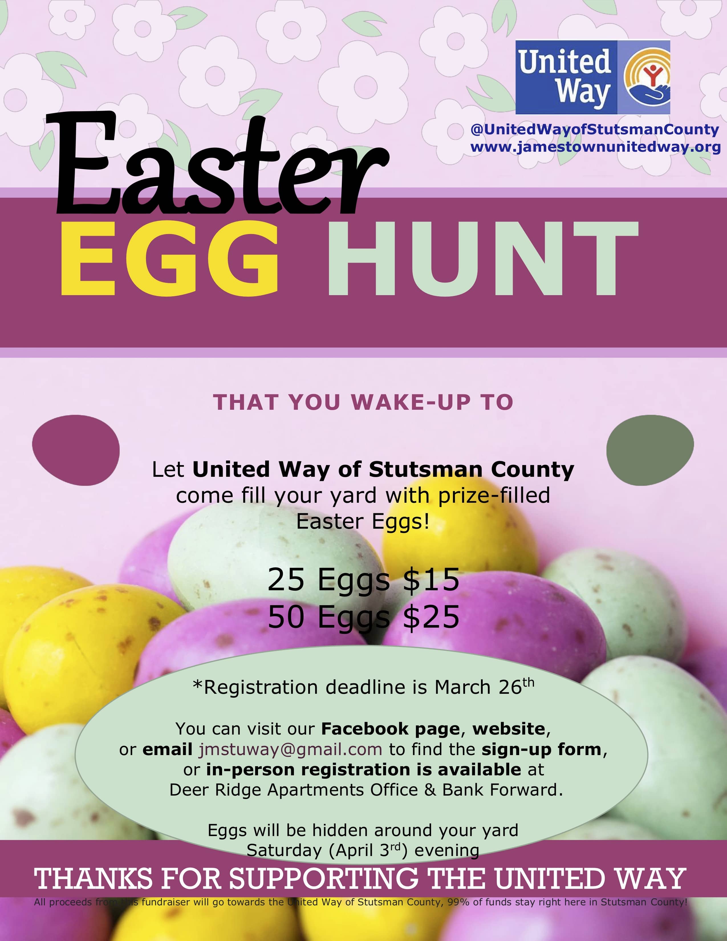 We will provide 25 Eggs $15 or 50 Eggs $25. All proceeds from this fundraiser will go towards the United Way of Stutsman County, 99% of funds stay right here in Stutsman County! Registration deadline is March 26th.