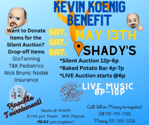 A benefit for Kevin Koenig will be held on May 13th at Shady’s. There will be a silent auction as well as pinochle tournament!