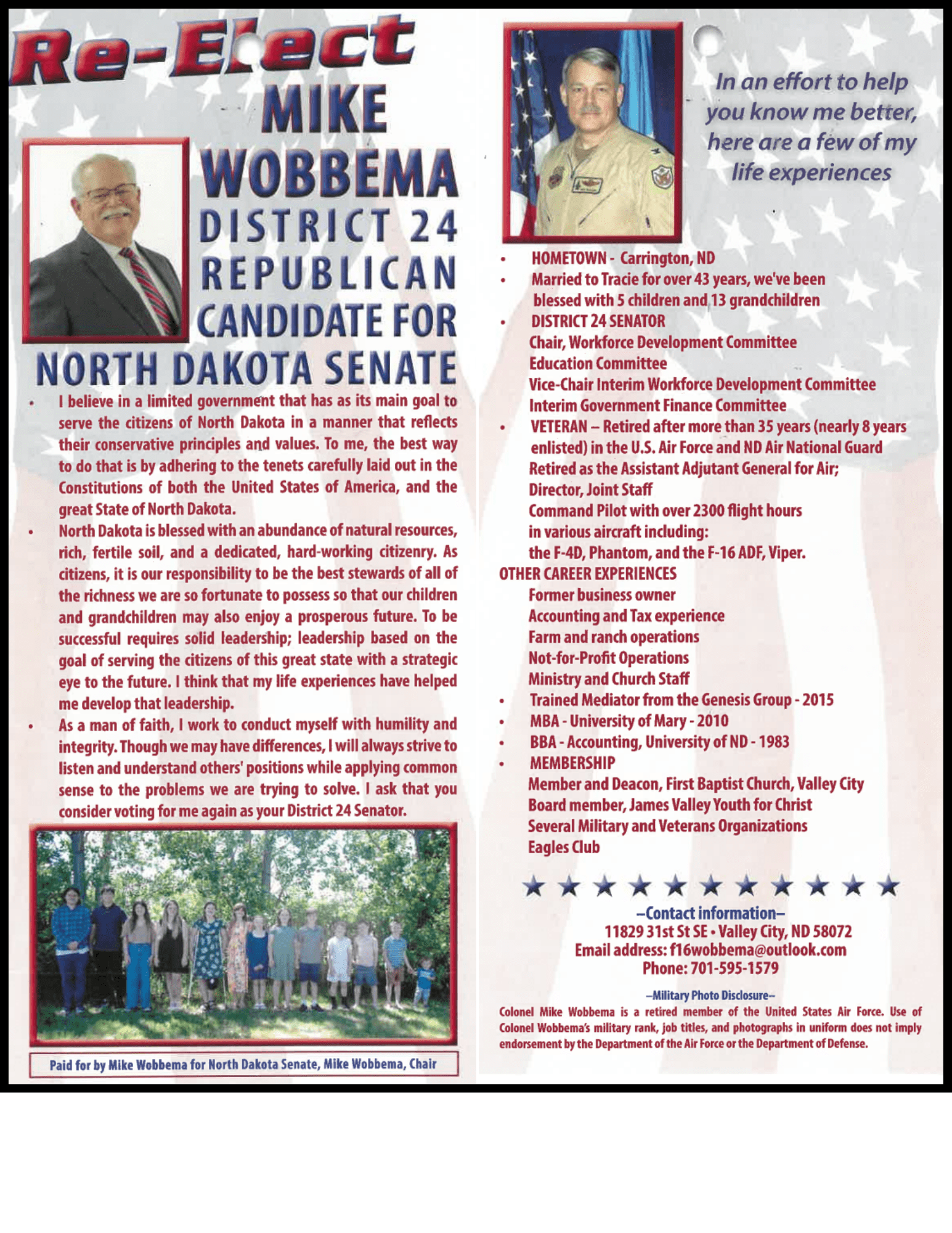 RE-ELECT MIKE WOBBEMA FOR ND SENATE DISTRICT 24
