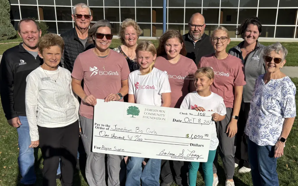 Front row: Shirley Jackson, board member, Community Foundation; Stacy Roers Irmen, Jamestown Bio Girls program leader; Elena and Mia Irmen, current and future Bio girls. Middle row: Joan Morris, board member, Community Foundation, Sierra Irmen, Bio Girl; Malina Reynolds, volunteer mentor for Bio Girls and Barb Lang, board member, Community Foundation. Back row: Travis Dillman, Kirk Heim, Dustin Jensen and Emily Bivens, all JCF board members.