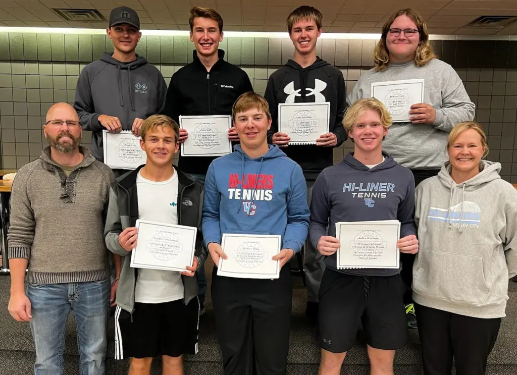 Top row l to r: Noah Tulp, Colin Hoff, Evan Schroeder, Jackson Eisen. Bottom row l to r: Coach Matt Nielson, Connor Liebersbach, Matthew Holm, Kellen Westman, Coach Susan Kringlie, not pictured is Coach Erik Kringlie.